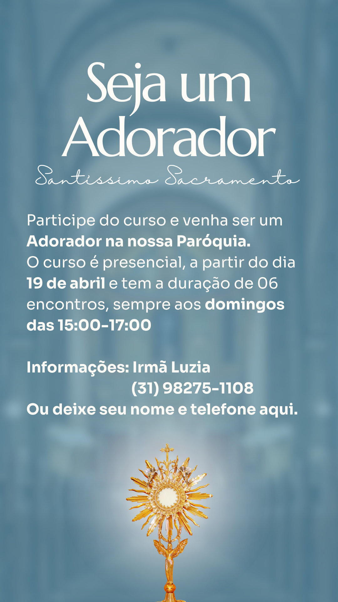 A Paróquia convida todos os fiéis a participarem do Curso de Adoradores do Santíssimo Sacramento, uma oportunidade especial de aprofundar a espiritualidade e o amor à presença real de Jesus na Eucaristia.
