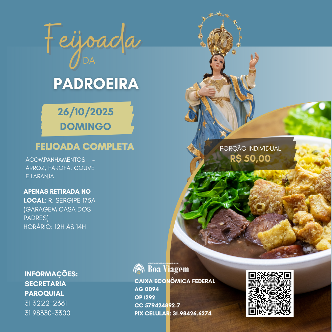 O Santuário Arquidiocesano da Santíssima Eucaristia – Paróquia Nossa Senhora da Boa Viagem tem o prazer de anunciar a tão esperada Feijoada da Padroeira 2025! Este é um convite para você e sua família desfrutarem de uma deliciosa feijoada enquanto contribuem para uma causa nobre.